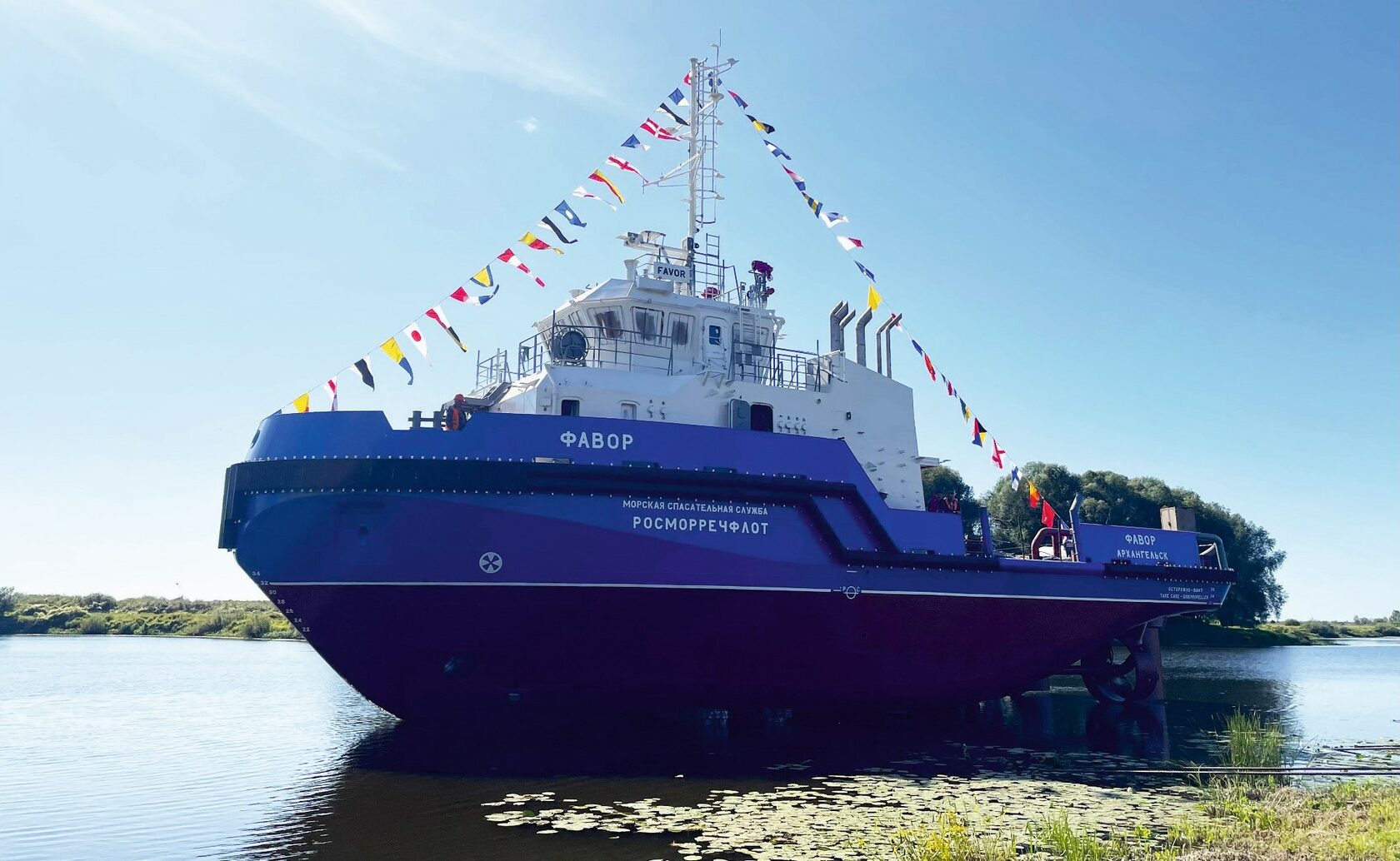 31 августа, на АО «Окская судоверфь» прошла торжественная церемония спуска на воду пятого корпуса «Фавор» из серии пяти морских противопожарных буксиров-спасателей Проекта NЕ025